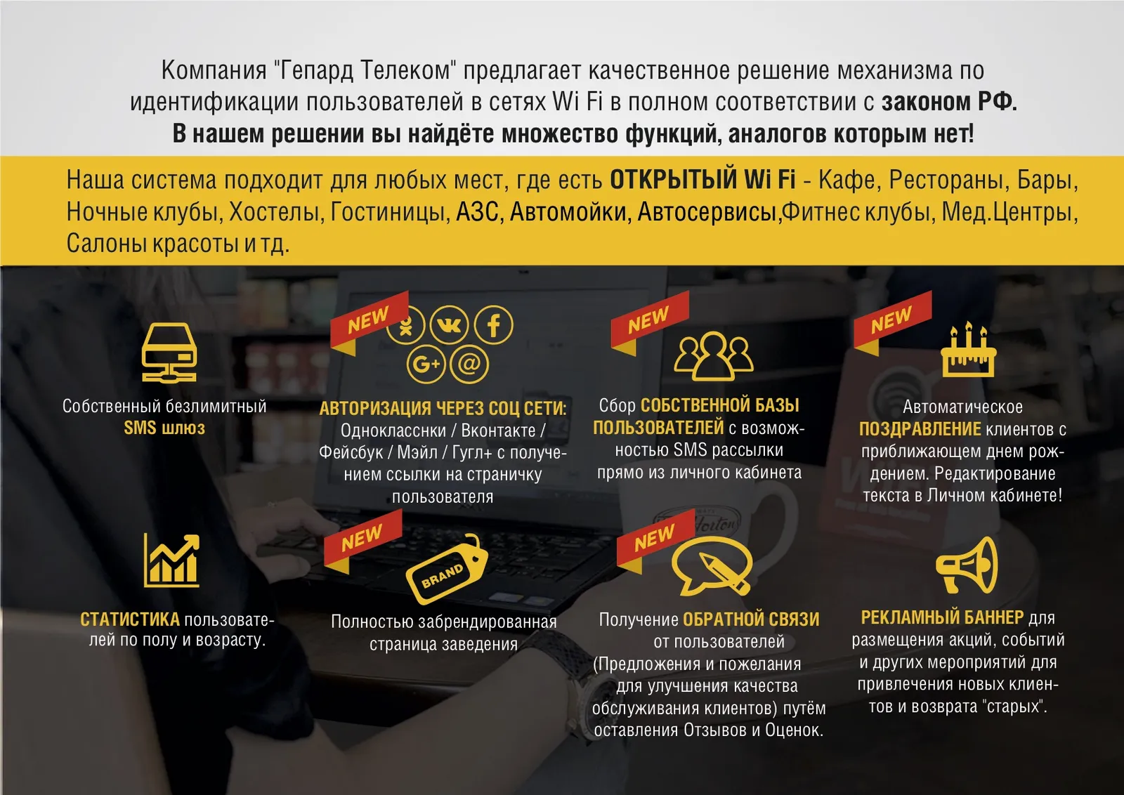 СИСТЕМА ГЕПАРД ТЕЛЕКОМ ОБЕСПЕЧИВАЕТ ИСПОЛНЕНИЕ ЗАКОНА ОБ ОБЯЗАТЕЛЬНОЙ СМС-ИДЕНТИФИКАЦИИ ПОЛЬЗОВАТЕЛЕЙПУБЛИЧНОЙ WI-FI СЕТИ ПО ТЕЛЕФОННОМУ НОМЕРУ. SMS-АВТОРИЗАЦИЯ ВАШИХ КЛИЕНТОВ ЗА НАШ СЧЕТ.