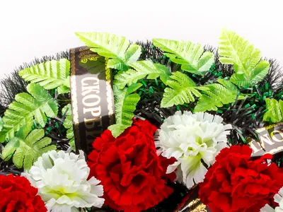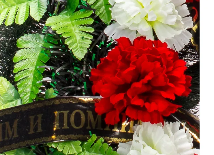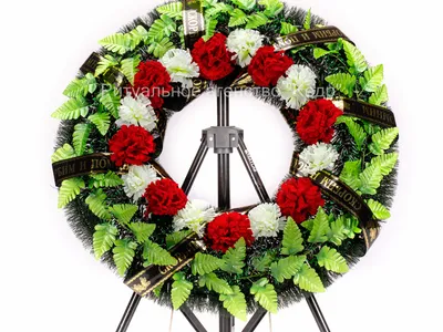 Ритуальное агентство "Кедр" предлагает ритуальный венок с цветами и лентой на похороны.