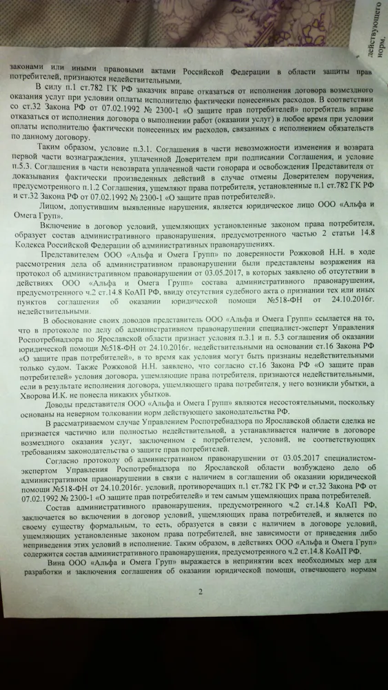 Было подано заявление в январе 2017 года в полицию с мотивировкой обязать юридическую компанию Наше Дело выполнять условия соглашения. Так же, мною была составлена жалоба в Роспотребнадзор ЯО о привлечении данного юр. лица к административной ответственности по ст. 14.8 КоАп РФ о включении в договор условий, ущемляющих права потребителя(10 и 29т ст. Закона о защите прав потребителей).