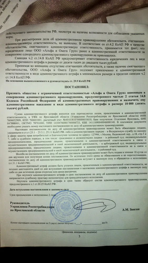 Недавно я получила постановление от антимонопольной службы в отношении ЮК "Наше Дело": Информация , противоречащая законодательству о регулировании конкуренции, была изъята с официального сайта компании. ООО "Альфа и Омега Групп" достаточно долгое время вели агрессивную рекламную компанию, обещая на всех ресурсах, абсолютно бесплатную юридическую консультацию и 100 процентов гарантию в завершении дела в пользу клиента. Из Роспотребнадзора пришло уведомнение о том, что юридическая компания была оштрафована на 10000 рублей.