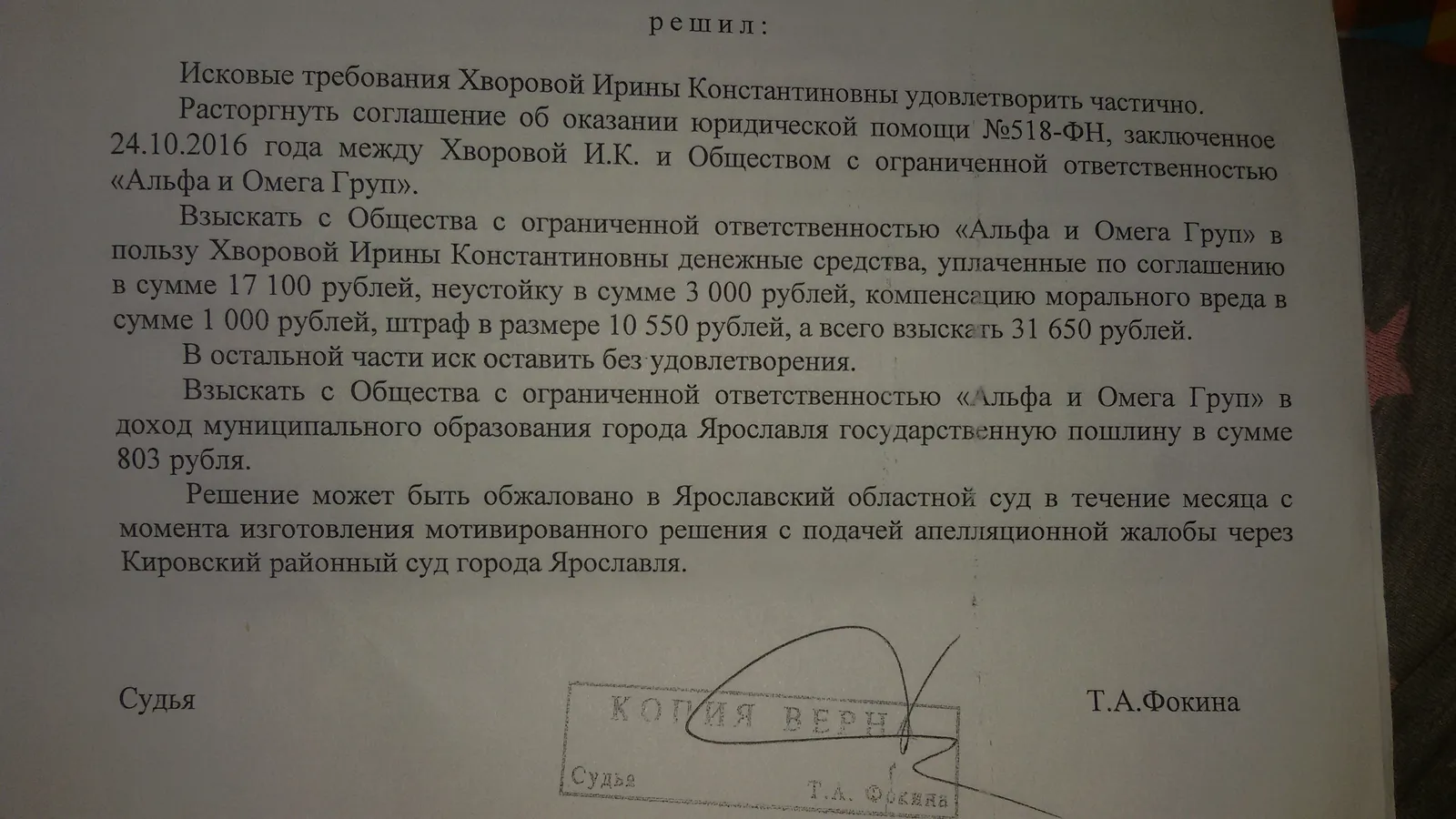 Юристы ООО "Альфа и Омега Груп" , если вы читаете мой отзыв, вас расстроит эта новость: ответчик , на сторону которого вы встали, вместо того, чтобы защищать мои нарушенные права, проиграл суд, а сумма к взысканию превысила 60000руб.