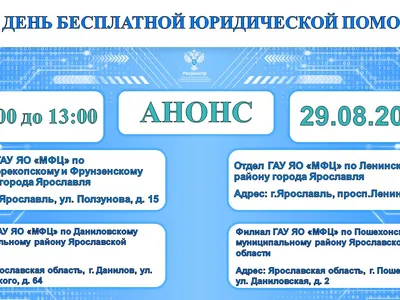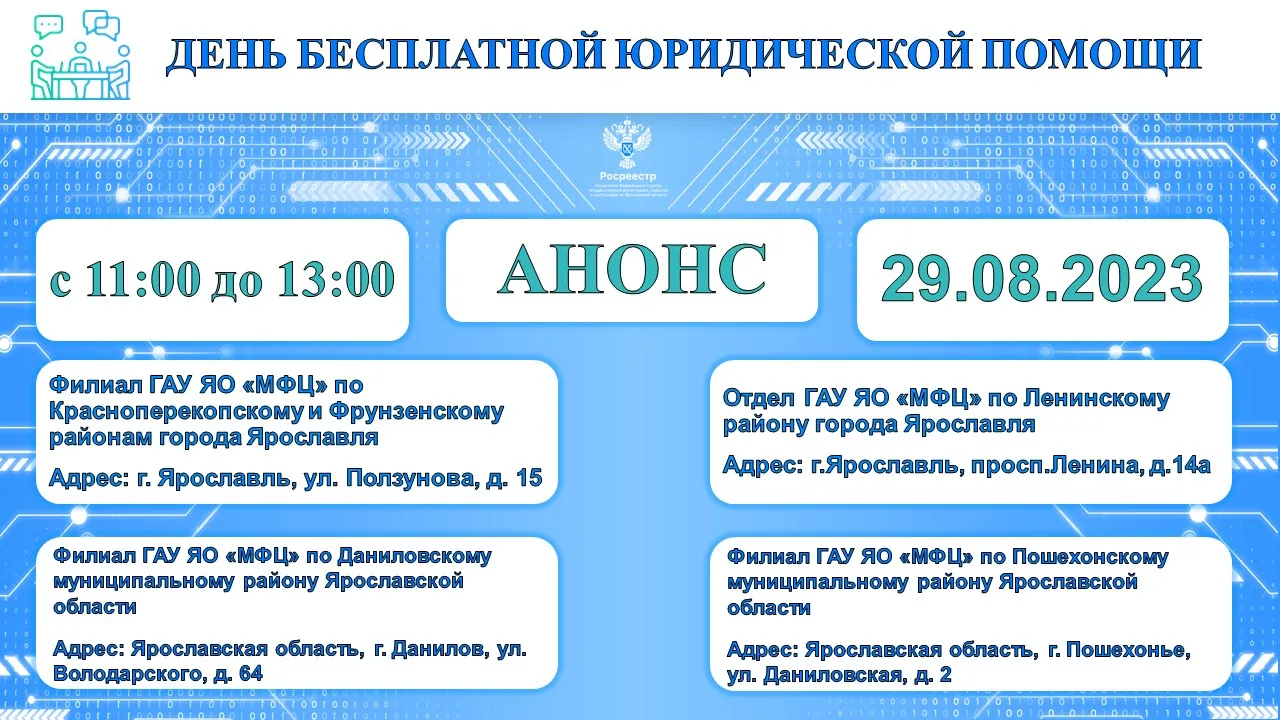 Мероприятие пройдет 29 августа 2023 года с 11:00 до 13:00 в офисах МФЦ Ярославской области, расположенных по адресам: