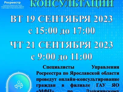 19 и 21 сентября специалисты Управления Росреестра по Ярославской области проведут онлайн-консультирование в филиале ГАУ ЯО «МФЦ» по Дзержинскому району города Ярославля (г. Ярославль, ул. Панина, д.38).