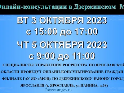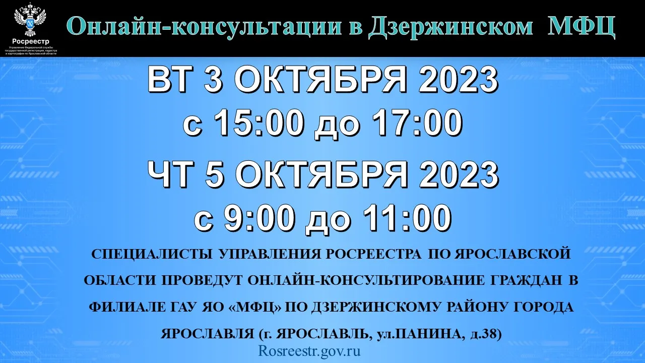 3 и 5 октября специалисты Управления Росреестра по Ярославской области проведут онлайн-консультирование в филиале ГАУ ЯО «МФЦ» по Дзержинскому району города Ярославля (г. Ярославль, ул. Панина, д.38).