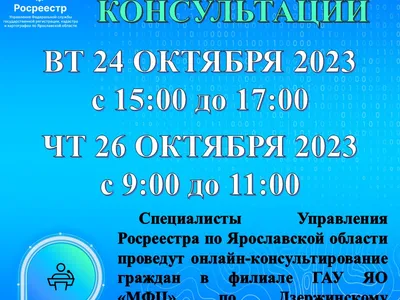 ✅24 и 26 октября специалисты Управления Росреестра по Ярославской области проведут онлайн-консультирование в филиале ГАУ ЯО «МФЦ» по Дзержинскому району города Ярославля (г. Ярославль, ул. Панина, д.38).