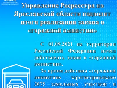 С 01.09.2021 на территории Российской Федерации начал действовать закон о «гаражной амнистии». За время действия «гаражной амнистии» на территории Ярославской области специалистами Ярославского Росреестра зарегистрировано 2675 земельных участков и 1783 гаража.Важно! Закон о «гаражной амнистии» дейс…