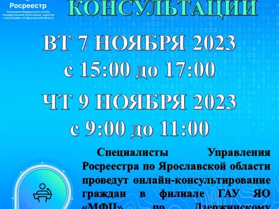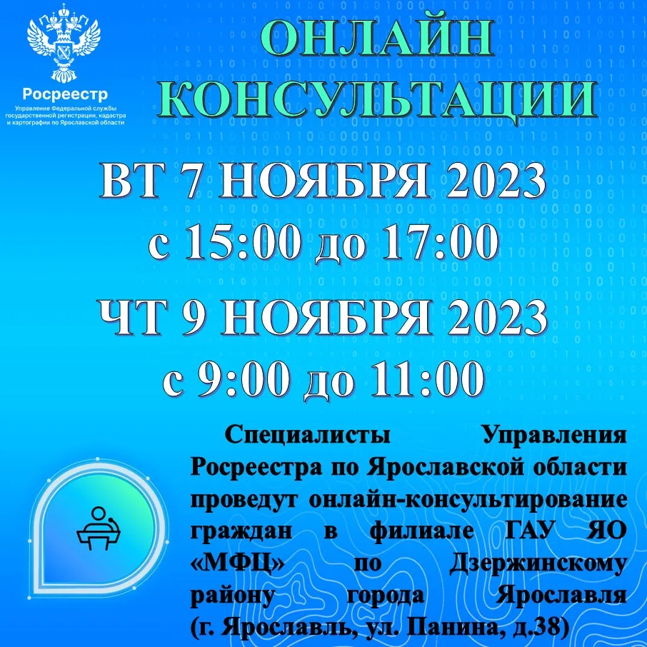 7 ноября 2023 года и 9 ноября 2023 специалисты Управления Росреестра по Ярославской области проведут онлайн-консультирование в филиале ГАУ ЯО «МФЦ» по Дзержинскому району города Ярославля (г. Ярославль, ул. Панина, д.38).