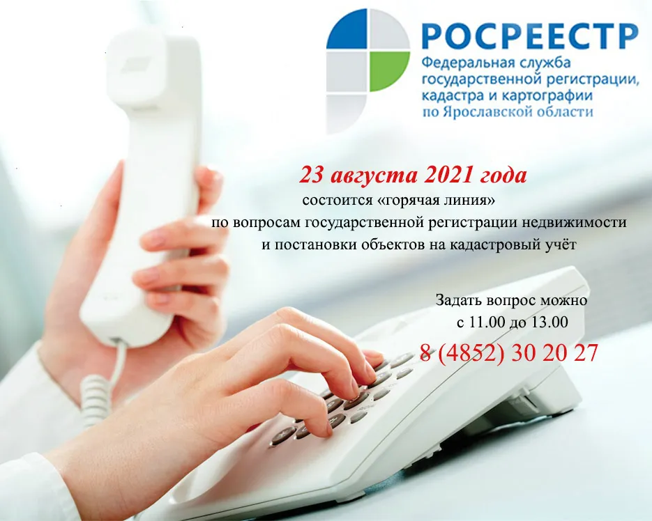 23 АВГУСТА 2021 ЯРОСЛАВСКИЙ РОСРЕЕСТР ПРОВОДИТ ГОРЯЧУЮ ЛИНИЮ ПО ВОПРОСАМ КАДАСТРОВОГО УЧЕТА И РЕГИСТРАЦИИ ПРАВ