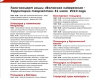 С 1 мая по 31 июля каждую субботу Волжская набережная встречала своих гостей незабываемым торжеством. Было проведено 13 акций, в их планировании и проведении приняли участие представители более 200 общественных и коммерческих организаций, учреждений культуры.