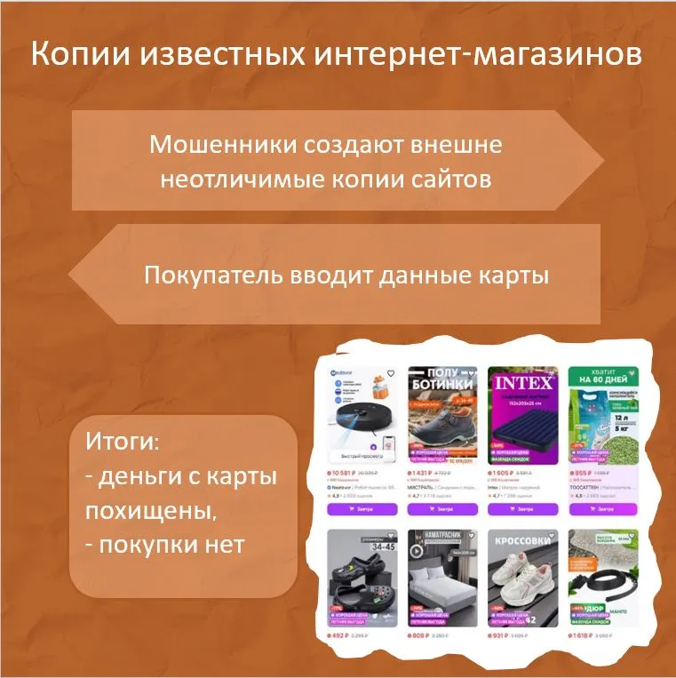 Копии известных интернет-магазинов. Мошенники создают поддельные сайты, внешне неотличимые от настоящих. Цель – похитить платежные реквизиты жертв. Человек вводит данные карты, которые затем попадают злоумышленникам. В дальнейшем они могут похитить средства со счета.