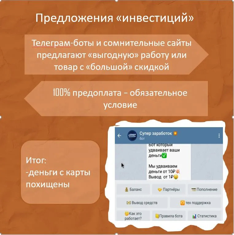 Предложения покупок на сомнительных сайтах и телеграм-ботах. Злоумышленники создают сайты-однодневки, где предлагаются невероятно выгодные предложения по покупке или инвестициям и продвигают их в соцсетях или мессенджерах. Необходима 100% оплата или предоплата. Затем мошенник исчезает.