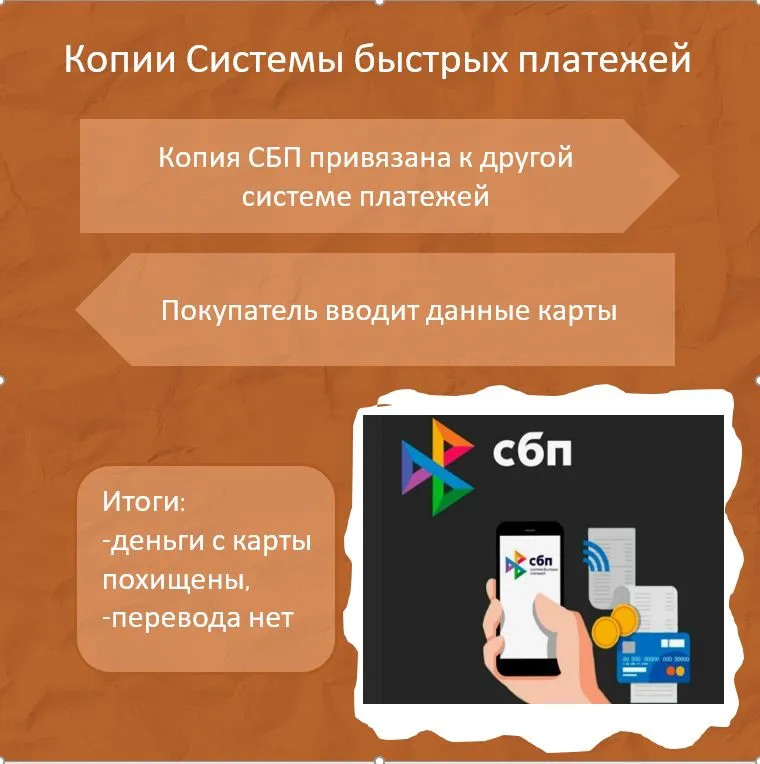 Копия СБП. Мошенники используют популярность системы быстрых платежей. Подделка, имитирующая интерфейс СБП, отправляет коды и ссылки на другие платежные системы, чтобы похищать средства.