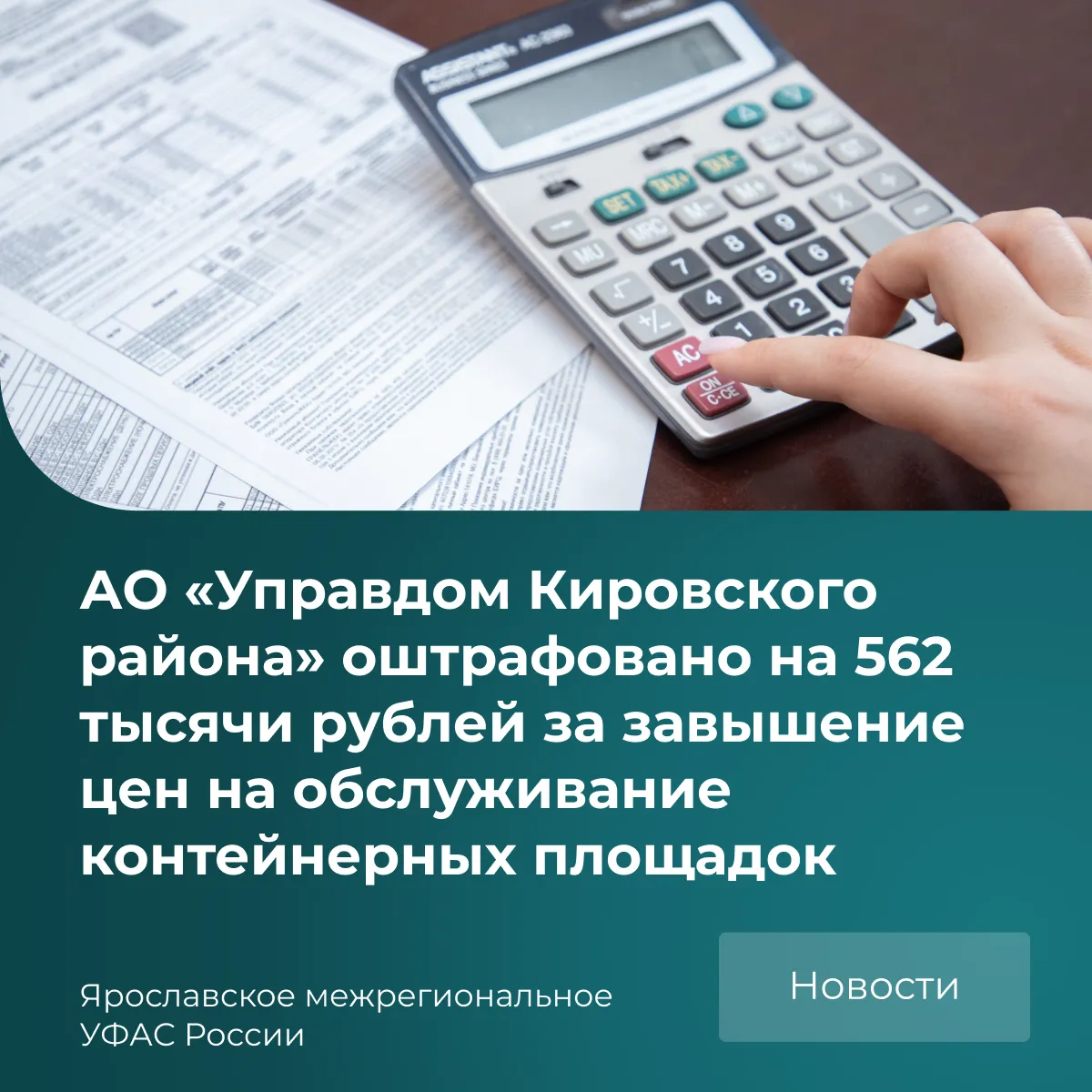 Ярославское межрегиональное УФАС России привлекло к административной ответственности АО «Управдом Кировского района». Компания была признана виновной в злоупотреблении своим доминирующим положением на рынке, устанавливая монопольно высокие цены на услуги по содержанию контейнерных площадок для ТСЖ и жителей. За это нарушение, предусмотренное ч. 1 ст. 14.31 КоАП РФ, наложен штраф в размере 562 500 рублей.