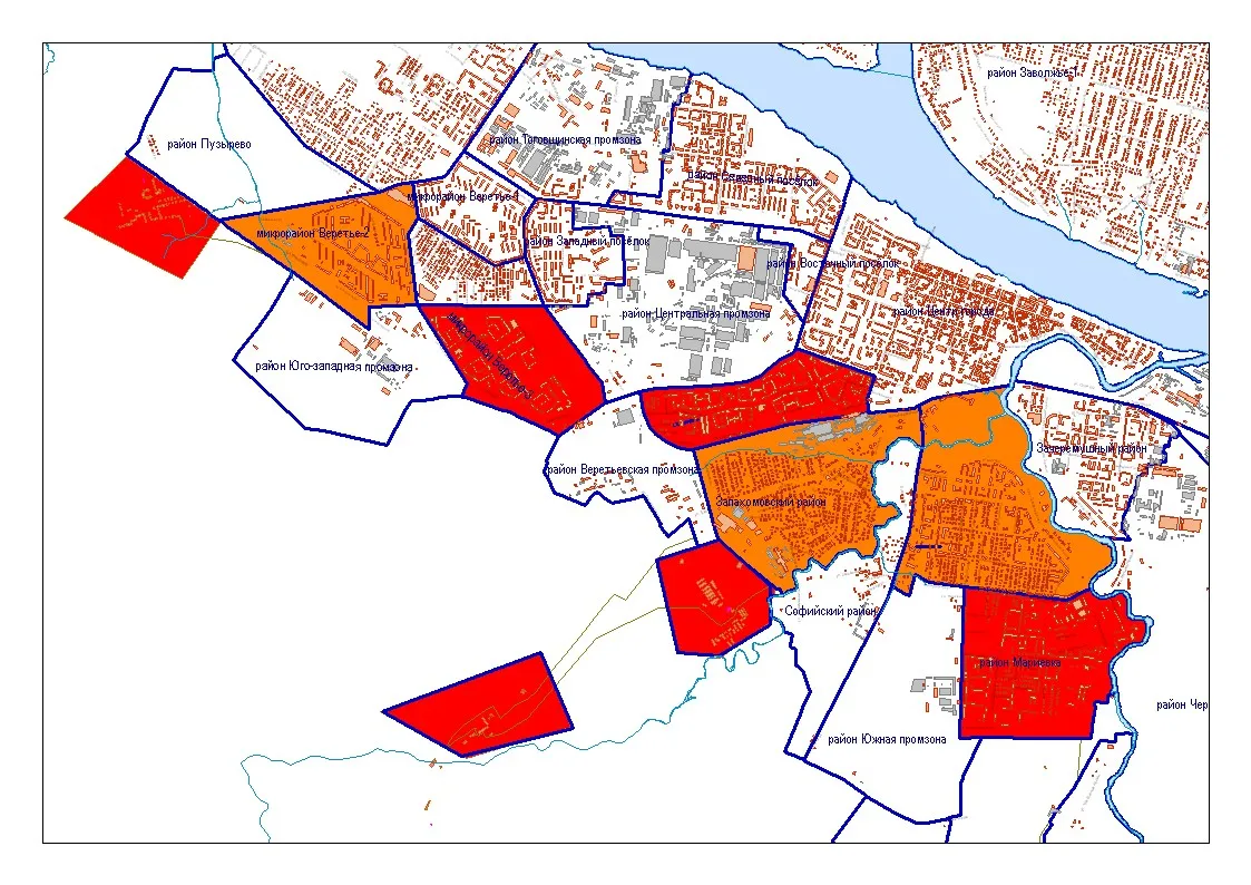 На карте (фото) красным цветом обозначены районы с полным прекращением подачи воды, оранжевым – те, которые будут находиться на пониженном давлении.