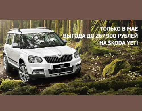 Только в мае 2016 г. при покупке SKODA Yeti Ваша выгода составит до 267 900 рублей*! Не упустите свою ŠKODA! Количество а/м ограничено.