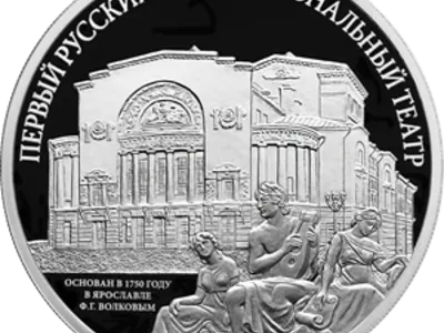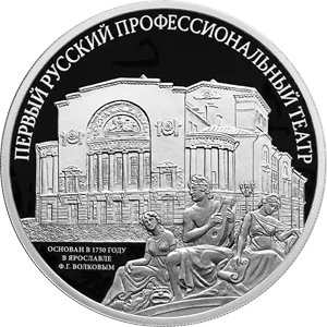 На оборотной стороне монеты расположены рельефные изображения здания Российского государственного академического театра драмы имени Федора Волкова и аллегорической скульптурной группы, украшающей его фасад; вверху по окружности имеется рельефная надпись «Первый русский профессиональный театр», внизу слева в три строки — надпись «Основан в 1750 году в Ярославле Ф.Г. Волковым».