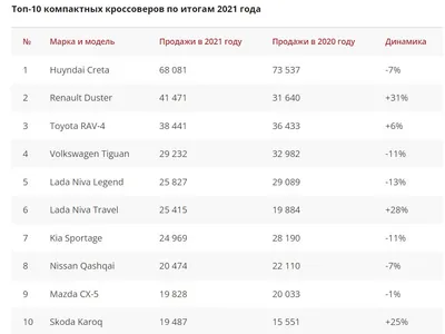 Лидером SUV по-прежнему остается Hyundai Creta. Однако впервые за последние несколько лет эта модель стала терять популярность. Продажи составили 68 081 автомобиль (-7% к 2020 году). В этом ощутимую роль сыграл дефицит этой модели в салонах, а также то, что после смены поколения средняя цена Creta перевалила за 1,5 миллиона рублей даже без дилерских наценок.