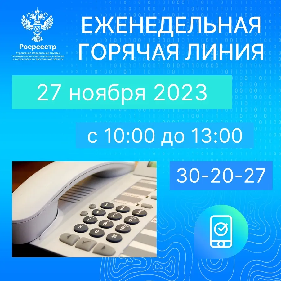 27 ноября 2023 года состоится еженедельная телефонная «Горячая линия» по вопросам государственного кадастрового учета и государственной регистрации прав.Задать интересующий вопрос можно с 10:00 до 13:00 (по местному времени) по телефону: 8 (4852) 30-20-27.