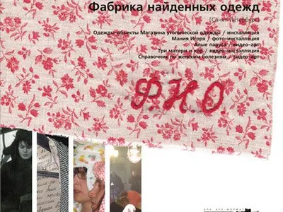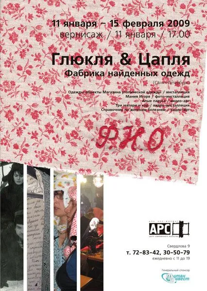 «Фабрика Найденных Одежд» — это объединение двух петербургских художниц, Натальи Першиной-Якиманской и Ольги Егоровой, известных под псевдонимами Глюкля и Цапля. Группа, которая сегодня является одной из самых плодотворных и энергичных на российской арт-сцене, была основана в 1995 году. ФНО работает в жанре перформанса, инсталляции, осуществляет видео- и звуковые проекты, практикует различные формы работы в городском и социальном пространстве. «Фабрика найденных одежд» — участник крупнейших выставок и форумов современного искусства, таких как «Davay», Russian Art Now (Берлин, Вена), Московская биеннале современного искусства и др. В скором времени Глюкля и Цапля станут первыми русскими актуальными художниками, творчество которых увидят зрители Новой Зеландии.