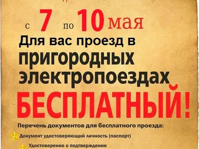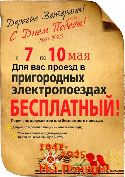 "Северная пригородная пассажирская компания" проводит акцию по предоставлению бесплатного проезда ветеранам и инвалидам Великой Отечественной ко дню Победы. Бесплатно проехать можно будет 7-10-го мая. Бесплатный билет не ограничивается числом поездок в рамках дней проведения акции. Оформить льготный билет можно будет в билетной кассе или у проводника в вагоне.