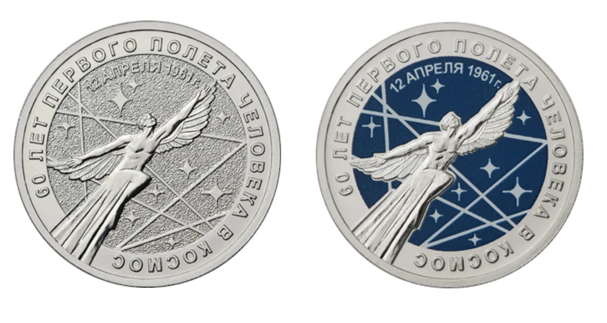 В этом году Банк России выпустил в обращение памятные монеты «60-летие первого полета человека в космос» 4-х видов: 25 рублей из недрагоценных металлов обычные, а также с цветным покрытием, серебряные номиналом 25 рублей с цветным покрытием и без цветной эмали.