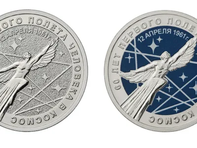 Серебряные монеты номиналом 25 рублей в диаметре 60 мм. Масса драгоценного металла (проба сплава – 925) каждой монеты составляет 169 г. На них расположены рельефные изображения летящей фигуры человека с крыльями и звезды на фоне стилизованных изображений звездного неба и мифологических животных – зодиакальных созвездий Тельца, Льва, Стрельца. Внизу по окружности - надпись: «12 АПРЕЛЯ 1961 г.», «60 ЛЕТ ПЕРВОГО ПОЛЕТА ЧЕЛОВЕКА В КОСМОС». Диаметр юбилейных монет из недрагоценных металлов меньше - 27 мм. На монетах также - летящая фигура человека с крыльями.