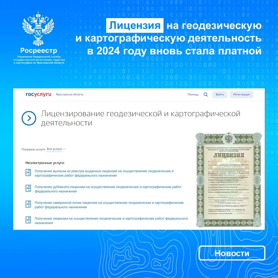 В связи с законодательными изменениями, вступившими в силу с января 2024 года, Управление Росреестра по Ярославской области сообщает, что за предоставление лицензии на осуществление геодезической и картографической деятельности, а также за внесение изменений в реестр лицензий по заявлениям, поданным с 1 января 2024 г. по 31 декабря 2029 г., потребуется оплатить государственную пошлину.