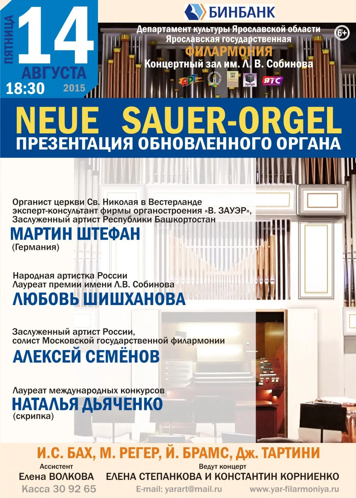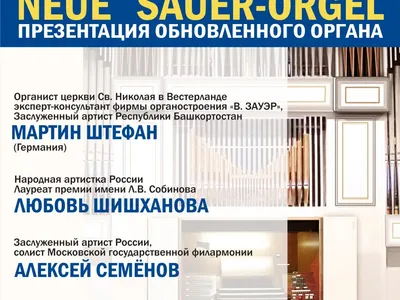 Презентация обновленного органа состоится 14 августа 2015 года в 18:30. В концерте примут участие органист церкви Св. Николая в Вестерланде, эксперт-консультант фирмы органостроения «В. ЗАУЭР» Мартин Штефан (Германия), заслуженный артист России, солист Московской государственной филармонии Алексей Семенов, народная артистка России Любовь Шишханова, лауреат международных конкурсов Наталья Дьяченко (скрипка). В программе прозвучат сочинения И.С. Баха, М. Регера, Й. Брамса, Дж. Тартини.