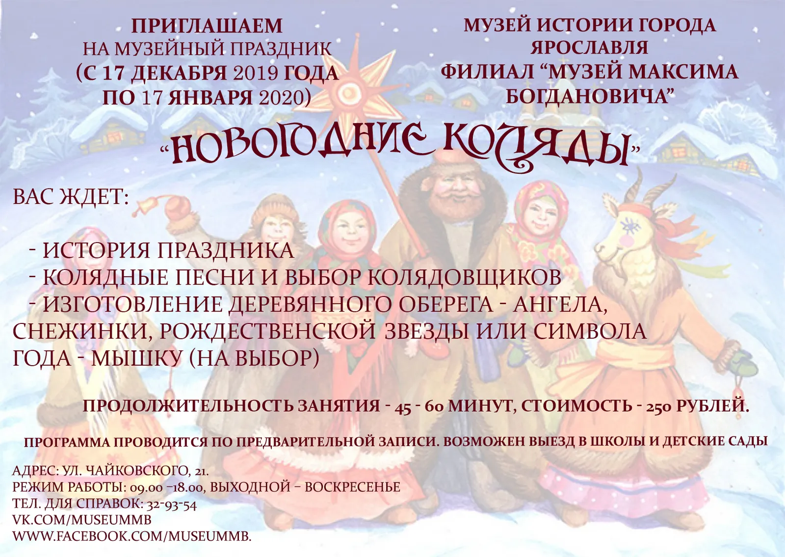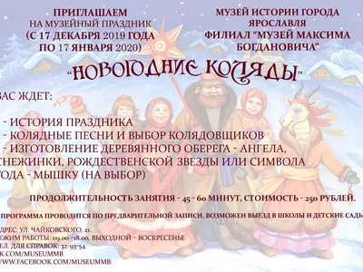 Уютная атмосфера деревянного дома поможет детям и взрослым окунуться в далекое прошлое наших предков, узнать историю праздника. Вместе мы приготовим украшения для дома, разучим Колядные песни, выберем Колядовщиков. Ни один посетитель в эти праздничные дни не уйдет из музея без подарка, сделанного собственными руками. Для всех желающих будет организован мастер-класс по росписи деревянной фигурки: Ангел, Рождественская Звезда или символ года - мышка (на выбор).