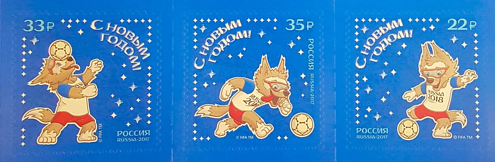 На почтовых марках изображён талисман Чемпионат мира по футболу FIFA 2018 в России™ — Волк Забивака в трёх разных позах на новогоднем фоне. Номиналы марок составляют 22, 33 и 35 рублей и соответствуют тарифам на пересылку конверта и заказной карточки по территории России и международной пересылке простого письма. Тираж марок – по 660 тыс. экземпляров.