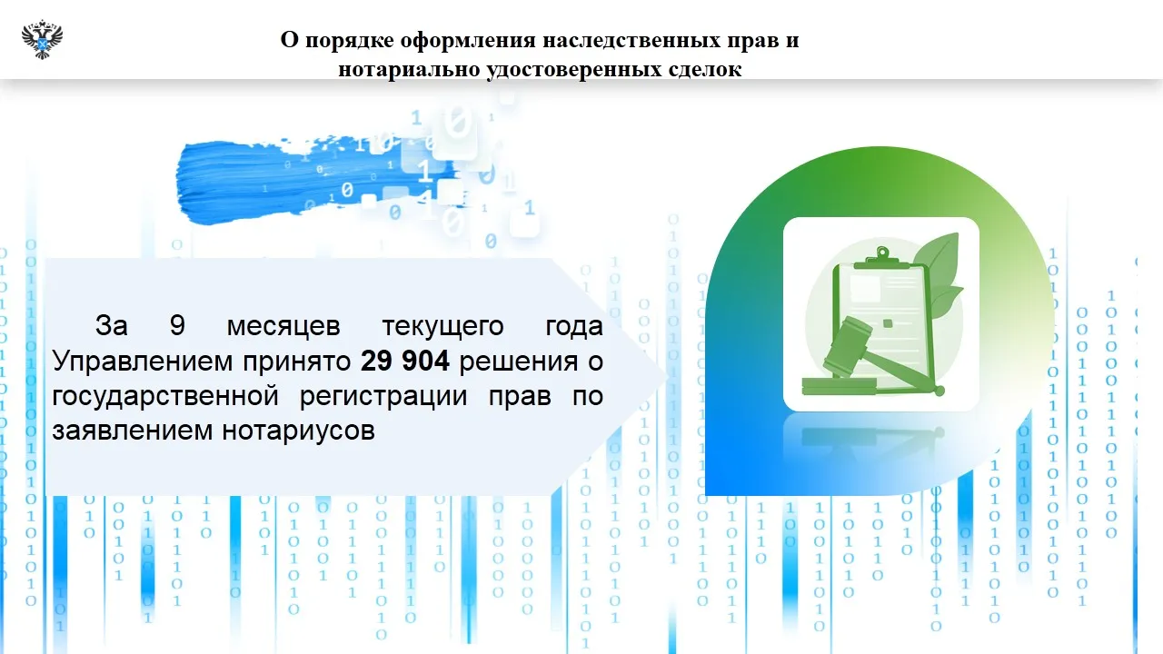 «За 9 месяцев текущего года Управлением принято 29 904 решения о государственной регистрации прав по заявлением нотариусов. Государственная регистрация прав осуществляется в течение одного рабочего дня с момента поступления полного комплекта документов. Взаимодействие с нотариусами области осуществляется оперативно, в рабочем порядке вопросы решаются по каждому конкретному заявлению», - пояснила руководитель Управления Елена Галеева.