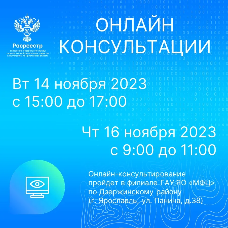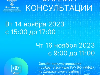 14 и 16 ноября 2023 года специалисты Управления Росреестра по Ярославской области проведут онлайн-консультирование в филиале ГАУ ЯО «МФЦ» по Дзержинскому району города Ярославля.