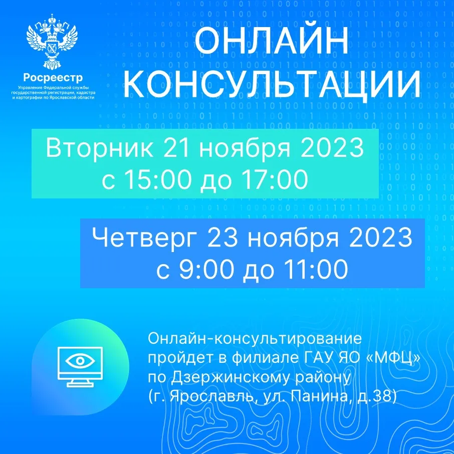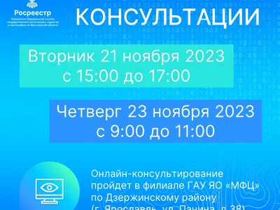 21 и 23 ноября 2023 года специалисты Управления Росреестра по Ярославской области проведут онлайн-консультирование в филиале ГАУ ЯО «МФЦ» по Дзержинскому району города Ярославля.