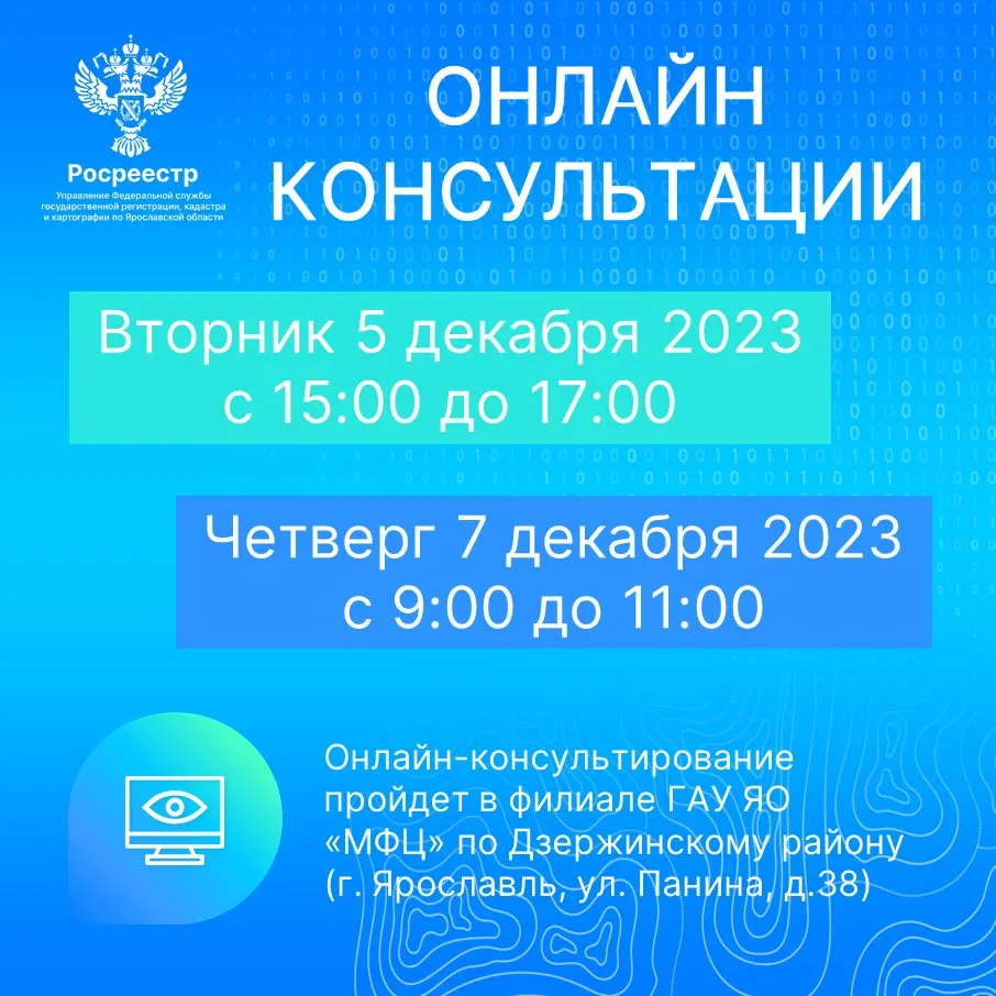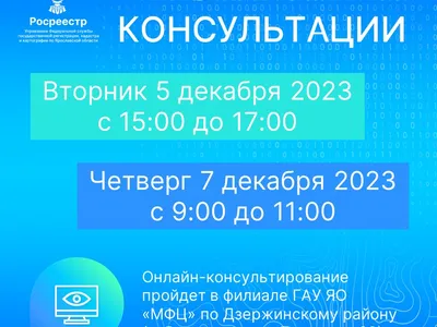 5 и 7 декабря 2023 года специалисты Ярославского Росреестра проведут онлайн-консультирование в филиале ГАУ ЯО «МФЦ»