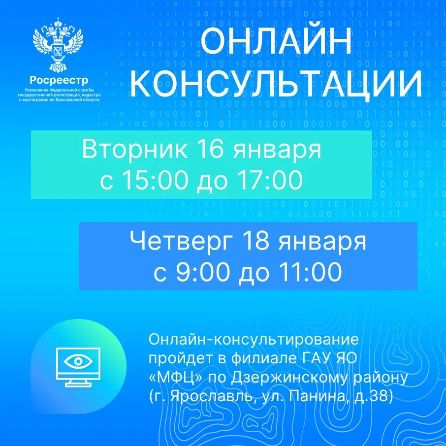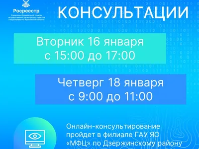 16 и 18 января специалисты Ярославского Росреестра проведут онлайн-консультирование граждан в филиале ГАУ ЯО «МФЦ» по Дзержинскому району города Ярославля.