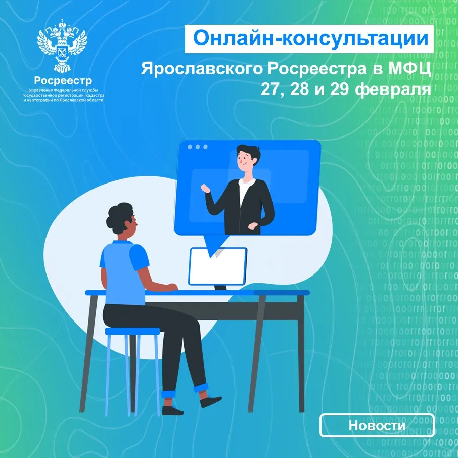 27, 28 и 29 февраля специалисты Ярославского Росреестра проведут онлайн-консультации в режиме видеоконференцсвязи в зонах электронных услуг трех филиалов МФЦ.