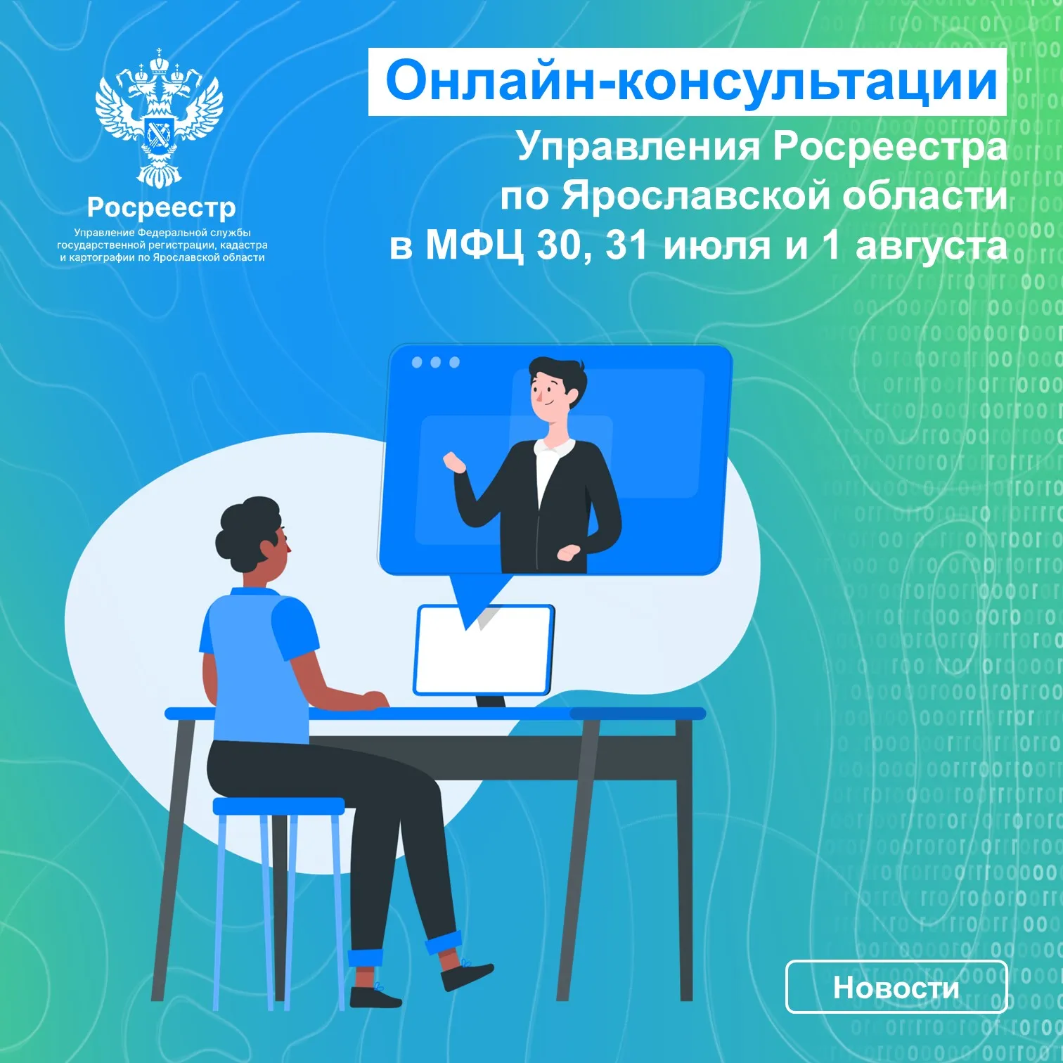 30, 31 июля и 1 августа специалисты Управления Росреестра по Ярославской области проведут онлайн-консультации в режиме видеоконференцсвязи в зонах электронных услуг четырех филиалов МФЦ.