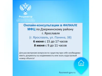 6 и 8 июня специалисты Управления Росреестра по Ярославской области проведут онлайн-консультирование в филиале ГАУ ЯО «МФЦ» по Дзержинскому району города Ярославля (г. Ярославль, ул. Панина, д.38),