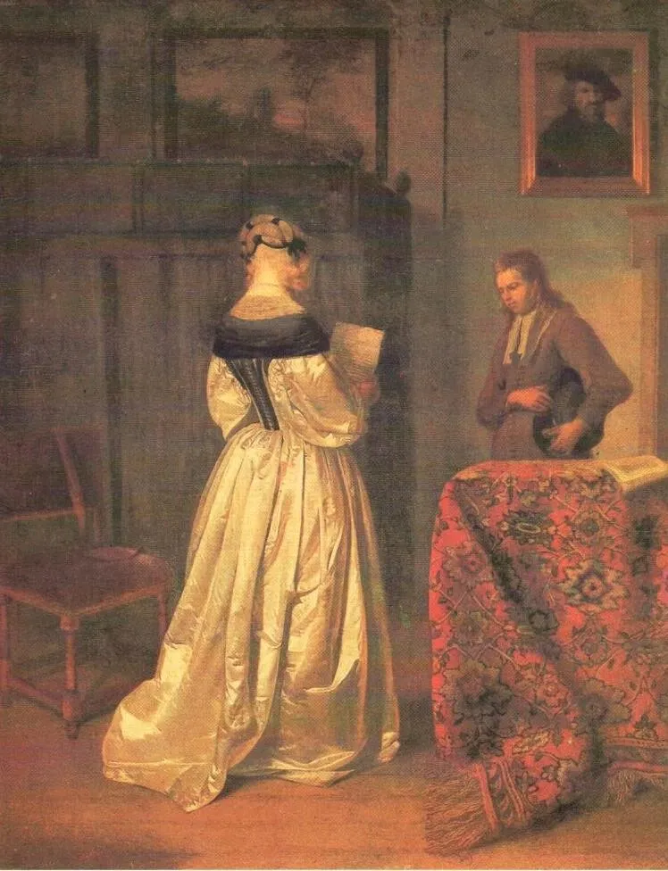 Картина «Получение письма» - образец элегантной живописи одного из главных голландских мастеров золотого века Герарда Терборха. В центре полотна –девушка с письмом возле стола, покрытого ковром. На заднем плане мы видим, как раз почтальона. Над ним – портрет в позолоченной раме. Можно предположить, что именно от мужчины, изображенного на нем, и получено письмо, которое девушка распечатала с такой поспешностью, даже не дождавшись ухода почтальона.