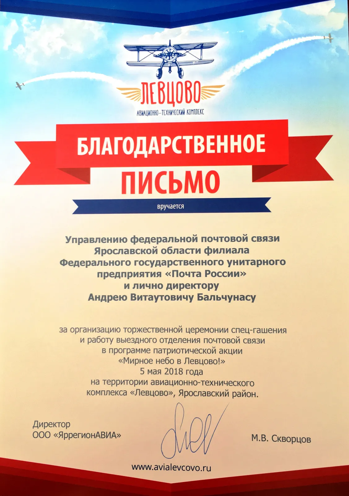 5 мая в канун празднования Великой Победы Ярославский филиал Почты России принял участие в патриотической акции «Мирное небо в Левцово» и провел торжественное спецгашение немаркированных открыток.