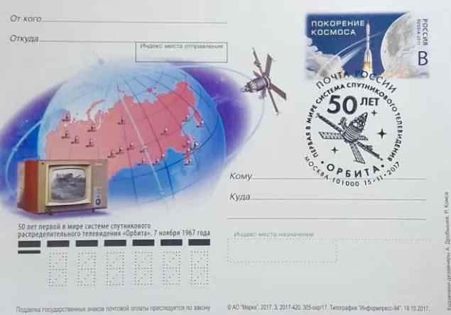 На почтовой карточке с оригинальной маркой изображен символический образ ракеты-носителя, запускаемой в космос; на основном изображении — система спутникового телевидения «Орбита» на базе космического аппарата «Молния-1». Тираж карточки – 20 тыс. экземпляров. Она поступит в продажу в отделения Почты России.