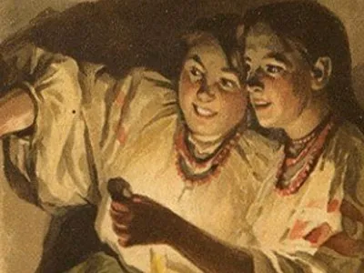 Немного позже большую популярность набрали открытки со сценами гадания. В декабре 1907 года издательство Община святой Евгении выпустило почтовую карточку по картине Ф.Ф. Бухгольца «Гаданье», 1901 и в 1905 годах – открытку по картине Н.К. Пимоненко «Святочное гаданье».