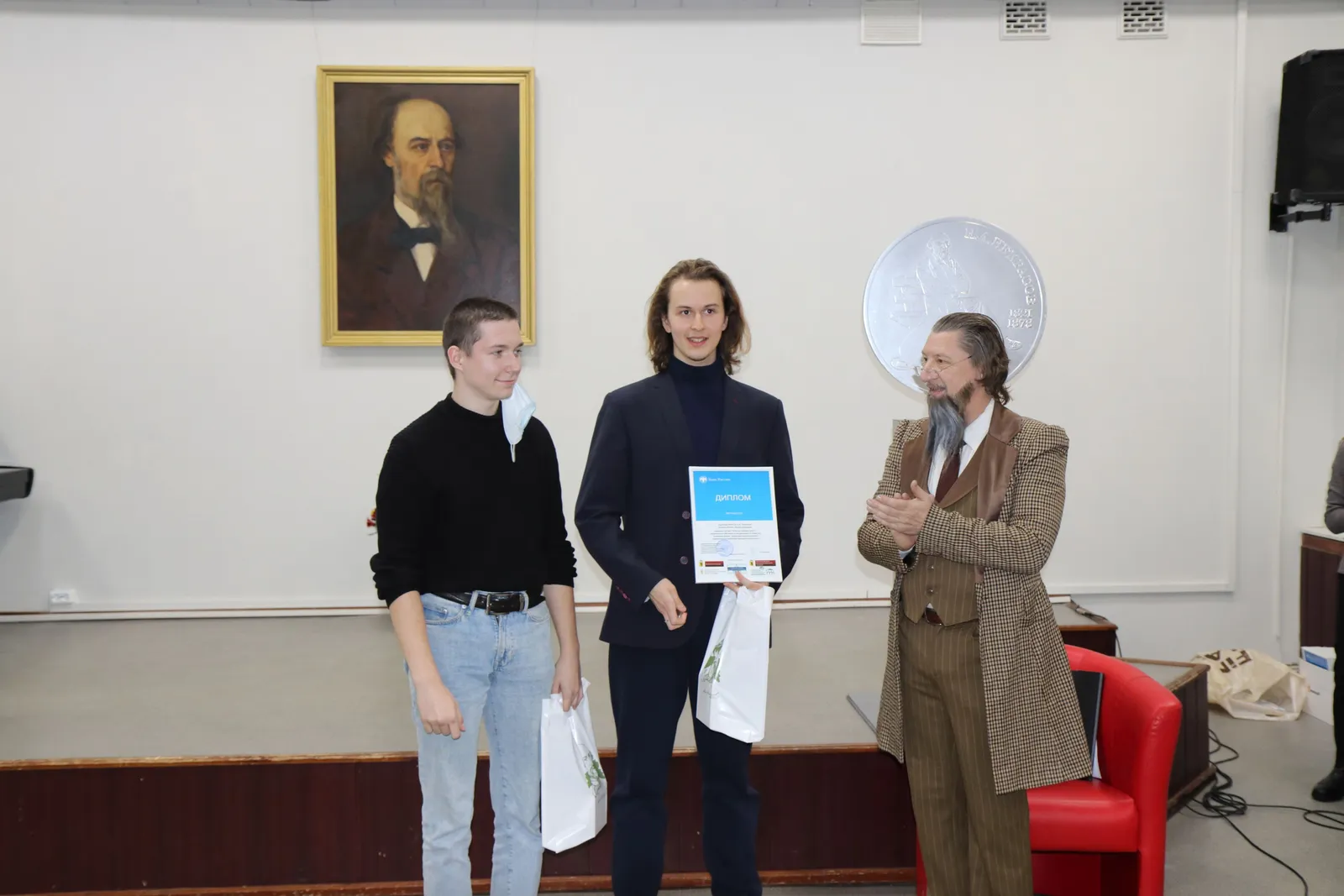 На итоговом празднике были представлены лучшие конкурсные работы и названы победители. Дипломы и награды - памятные монеты Банка России студентам вручал «сам Николай Некрасов»: ведущий конкурса выступил в роли великого поэта.