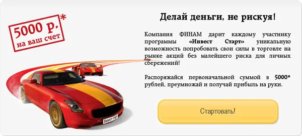 Только этой осенью компания "ФИНАМ" в рамках Всероссийского конкурса "ИНВЕСТ СТАРТ" выделит по 5000 рублей для каждого желающего жителя ярославского региона попробовать свои силы на рынке акций.
