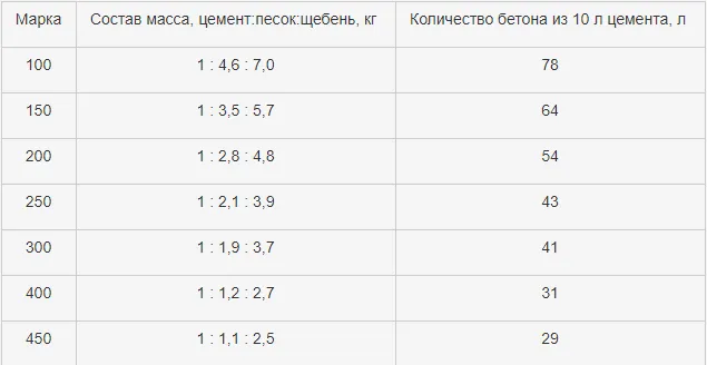 От чего она зависит? От пропорции в бетоне: цемента, воды и сыпучих (щебня или гравия, песка). (Смотри таблица 1 )