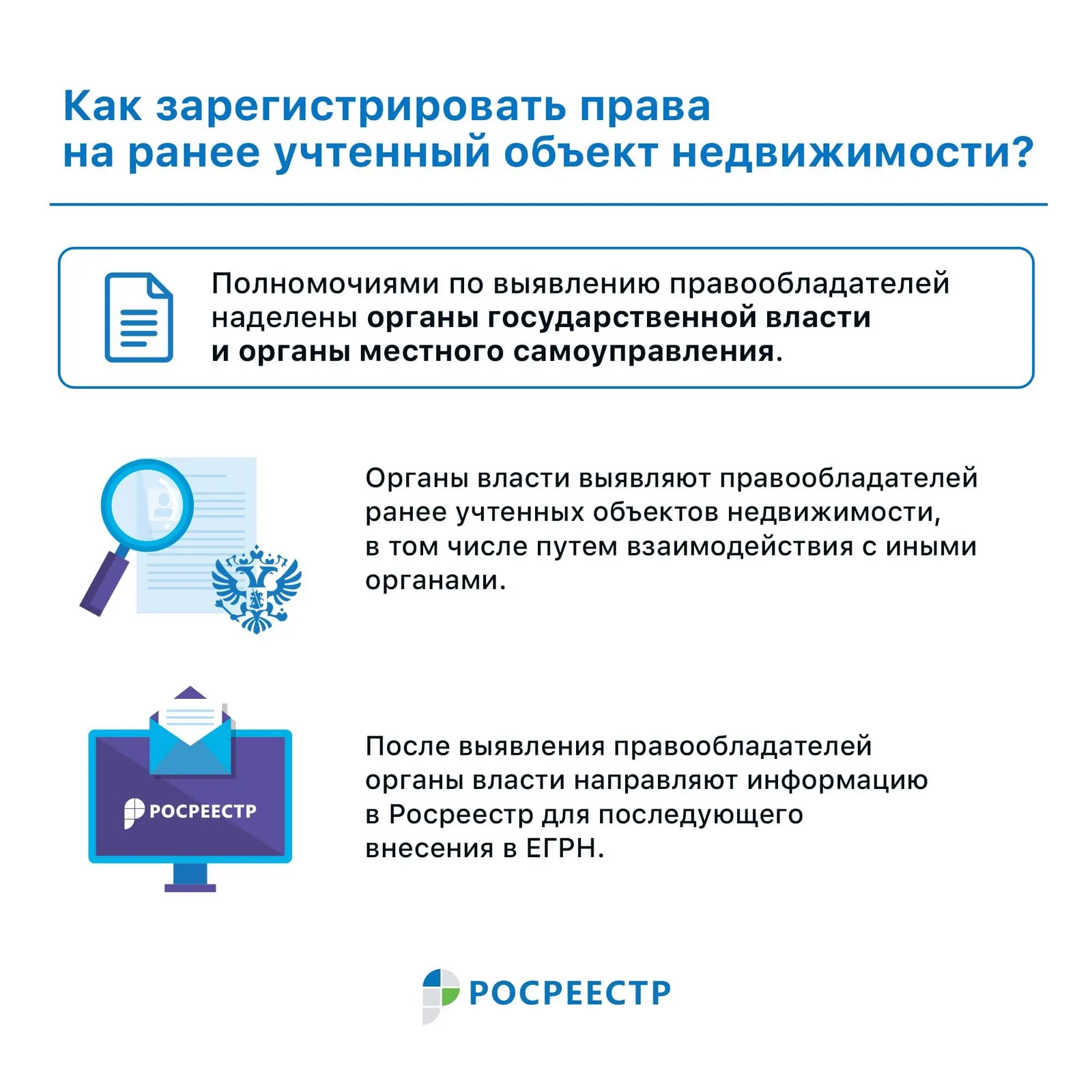 Напоминаем, что полномочиями по выявлению правообладателей наделены органы государственной власти и органы местного самоуправления. Они выявляют правообладателей ранее учтенных объектов недвижимости, в том числе путем межведомственного взаимодействия с иными органами, и направляют информацию в Росреестр для последующего внесения в ЕГРН.