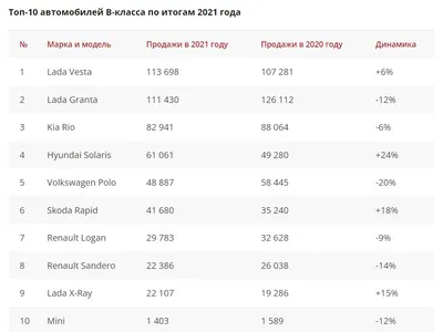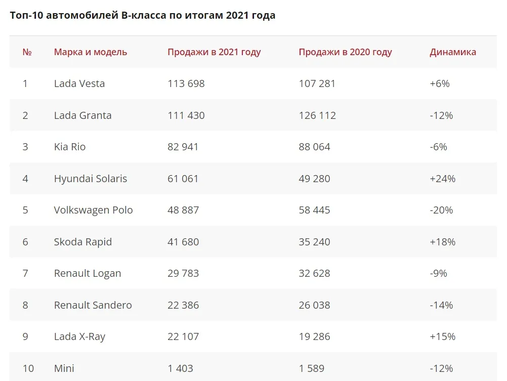 Рейтинг автомобилей В-класса в России давно сформировался и последние несколько лет практически не менялся. Тем интересней, что по итогам 2021 года он претерпел заметные изменения. Прежде всего, здесь поменялся лидер. Частые простои конвейеров в Тольятти и более стабильная работа завода в Ижевске привели к тому, что автомобили Lada Vesta было проще купить, чем Granta. В итоге (пусть и совсем с небольшим преимуществом) лидером рейтинга оказалась именно первая модель. Всего покупателей нашли 113 698 Lada Vesta. В то время как Granta (111 430 а/м), оказавшаяся на втором месте, недосчиталась 12% от прежнего объема реализации.