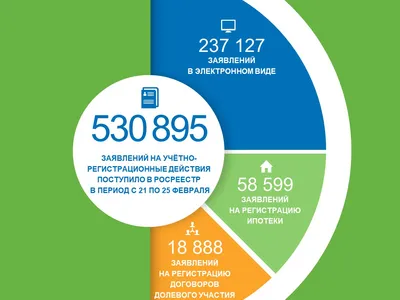 За неделю c 21 по 25 февраля 2022 года на учётно-регистрационные действия в Росреестр подано 530 895 заявлений. При этом в электронном виде в ведомство поступило 237 127 пакетов документов, а их доля составила около 45% от общего числа.