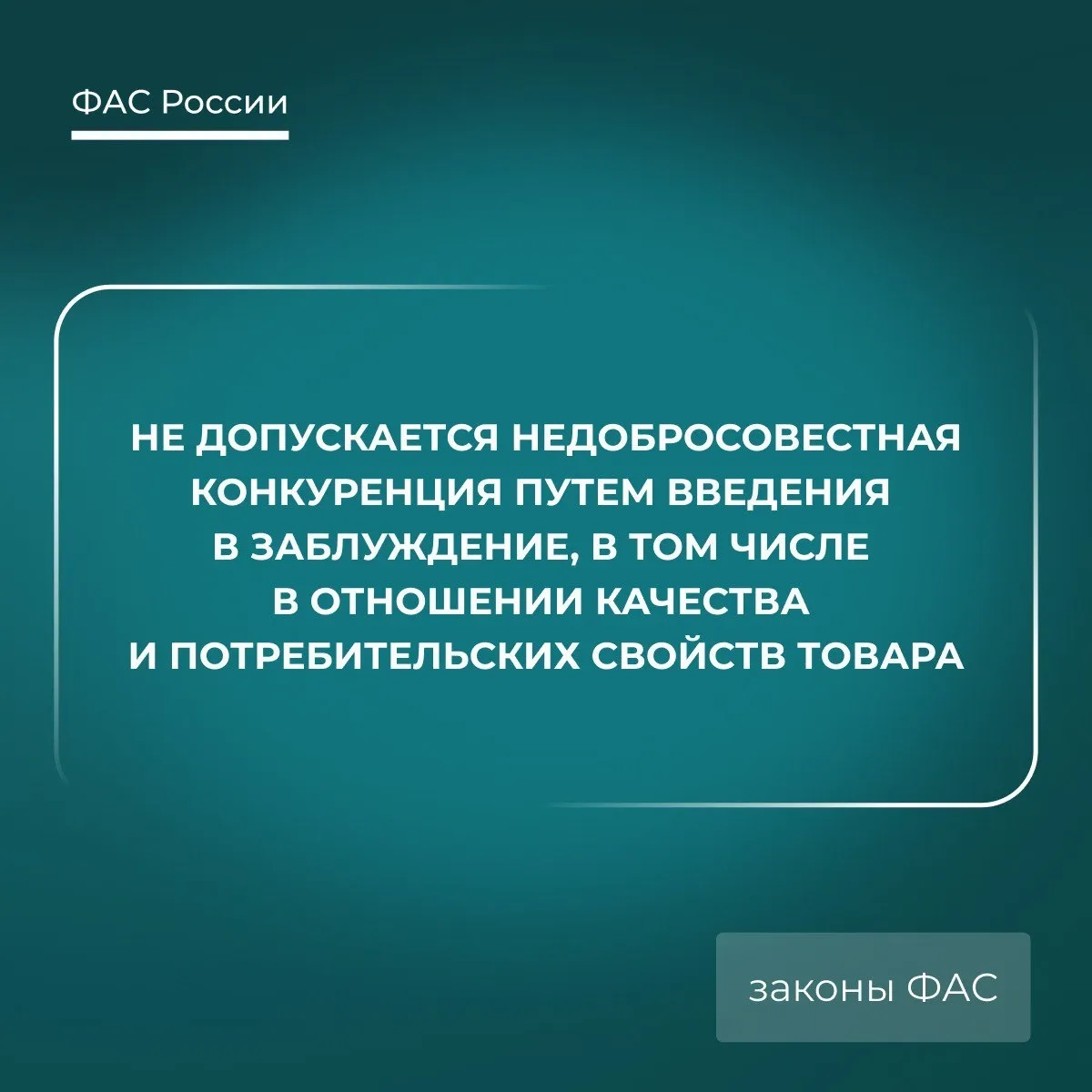 Законы ФАС — в новом формате В новом году мы продолжим рубрику «Законы ФАС». При этом немного поменяем ее формат. Будем вспоминать конкретные выдержки из антимонопольного законодательства и делиться примером по теме. Начнем с Закона о защите конкуренции. Вспомним статью 14.2. Запрет на недобросовестную конкуренцию путем введения в заблуждение. Не допускается недобросовестная конкуренция путем введения в заблуждение, в том числе в отношении качества и потребительских свойств товара, предлагаемого к продаже, назначения такого товара, способов и условий его изготовления или применения, результатов, ожидаемых от использования такого товара, его пригодности для определенных целей. Пример