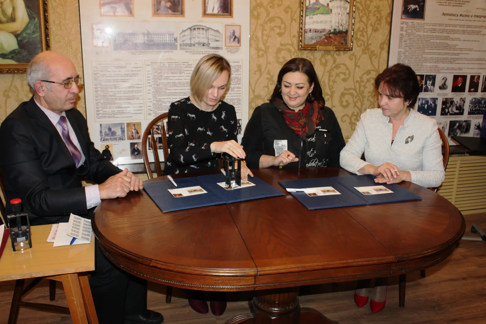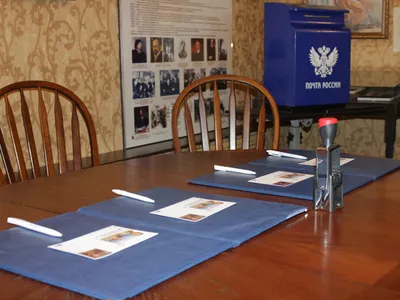 Спецштемпелем гасили марку из почтового блока, которая сегодня вышла в почтовое обращение. На почтовой марке изображена картина С.А. Виноградова «В доме», на полях почтового блока: картины «Автопортрет» и фрагмент картины «В доме».